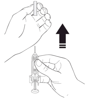 8. Ta nålehetten av sprøyten ved å holde rundt beholderen og trekke nålehetten forsiktig rett av og bort fra kroppen din uten å vri. Kast nålehetten. Du skal ikke sette nålehetten tilbake på sprøyten. Ikke skyv inn stempelet, og ikke berør nålen eller rist sprøyten.