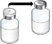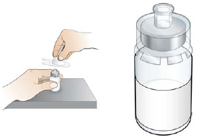 Hold området der hetteglasset og hetteglassadapteren møtes, mellom fingrene og drei hetteglasset forsiktig ved å rotere i håndleddet til alt pulveret har løst seg opp og væsken i hetteglasset er klar og fargeløs.