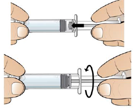 Trinn 3a: Fest stempelet av klar plast til den ferdigfylte sprøyten med sterilt vann ved å sette den gjengede enden av stempelet inn i sprøyten og forsiktig vri stempelet med klokken inn på det grå sprøytestempelet til du føler lett motstand. Ikke stram for mye.