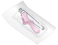 Etter injeksjon bruker du tommelen (eller en fingertupp) til å aktivere det rosa sikkerhetsdekslet ved å skyve dekslet forover med samme hånd til du hører og/eller føler at det klikker og låses på plass over nålen.