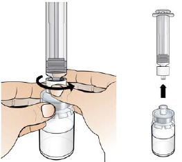 Fest sprøyten på 1 ml til adapteren til hetteglasset med oppløst Nplate ved å dreie sprøytespissen med klokken inn på hetteglassadapteren til du føler lett motstand.
