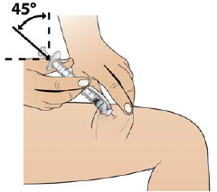 Ta forsiktig tak med den ene hånden rundt det rengjorte området av huden og hold godt fast. Hold sprøyten (som en blyant) med den andre hånden i en vinkel på 45 grader i forhold til huden.