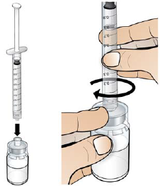 C. Snu hetteglassenheten og sprøyten opp ned, slik at hetteglasset er rett over sprøyten.