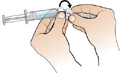 Fjern den klare nålebeskyttelsen ved å holde i sprøyten med den ene hånden og forsiktig trekke beskyttelsen rett av med den andre hånden.