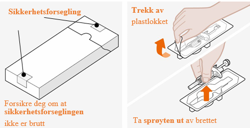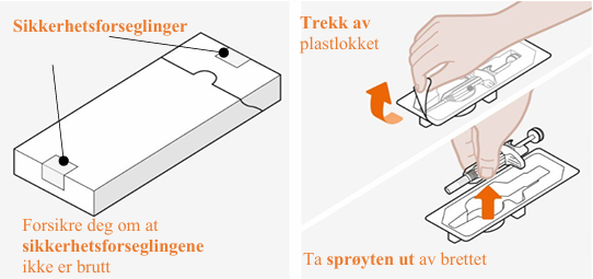 Sprøyten skal ikke brukes hvis sikkerhetsforseglingen på kartongen er brutt. Hetten skal ikke fjernes på dette trinnet. |