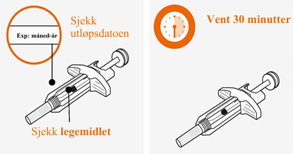 Skal ikke brukes hvis utløpsdatoen har passert. Sprøyten skal ikke varmes i mikrobølgeovn, varmt vann, eller direkte sollys. Skal ikke injiseres hvis oppløsningen ser grumsete eller misfarget ut, eller har partikler. Sprøyten skal ikke brukes hvis den har ligget utenfor esken i mer enn 8 timer. Hetten skal ikke fjernes på dette trinnet. |