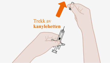 Ikke la kanylen røre noen overflater. Ikke rør kanylen. Ikke rør stempelet på dette trinnet, siden du ved et uhell kan presse ut væske og vil dermed ikke få din fulle dose. Ikke fjern noen luftbobler fra sprøyten. Ikke sett kanylehetten tilbake på sprøyten, siden det kan føre til en stikkskade. |