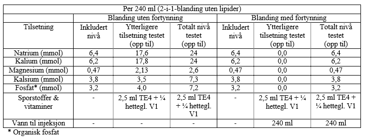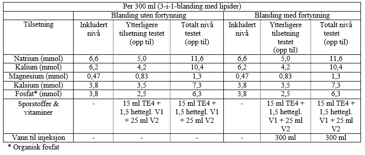 Ingen tilsetninger skal gjøres til posen uten først å sjekke kompatibiliteten. Det kan resultere i dannelse av partikler eller nedbryting av lipidemulsjonen. Dette kan føre til blokkering av blodårene.