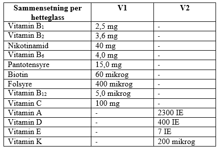 Sammensetningen av vitaminer og sporstoffer er illustrert i tabellene 5 og 6.