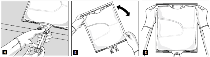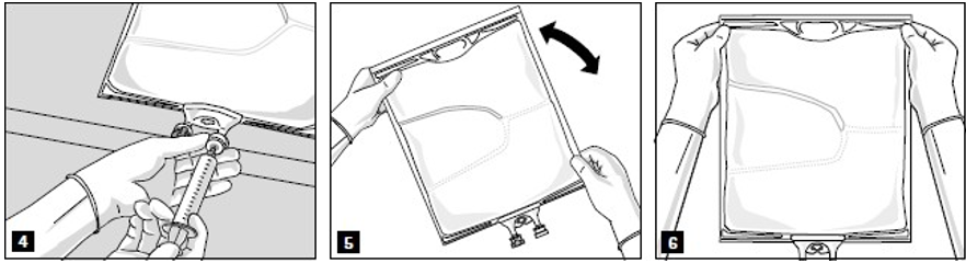 Etter at innholdet i alle kamrene er blandet og aluminiumsforseglingen er fjernet (figur 3A), kan forlikelige tilsettinger tilføres via tilsettingsporten (figur 4). Bland innholdet grundig (figur 5) og inspiser blandingen visuelt (figur 6). Blandingen er en melkehvit, homogen olje-i-vann-emulsjon. Emulsjonen skal ikke vise tegn på faseseparasjon.