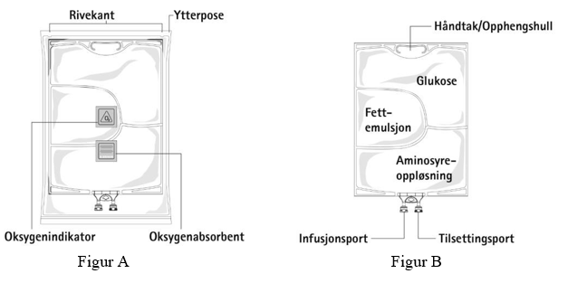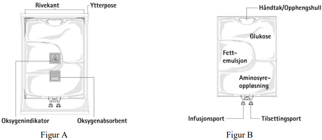 Figur A: Flerkammerposen er pakket i en beskyttende ytterpose. Mellom posen og ytterposen er det plassert en oksygenabsorbent og en oksygenindikator. Posen med oksygenabsorbent er laget av inert materiale som inneholder jernhydroksid.