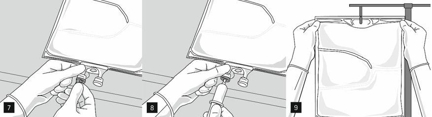 Fjern aluminiumsfolien fra infusjonsporten (figur 7) og fest den til infusjonssettet (figur 8). Bruk et ikke-ventilert infusjonssett eller steng luftinntaket på et ventilert sett. Heng posen på et infusjonsstativ (figur 9) og utfør infusjonen ved bruk av standard infusjonsteknikk.
