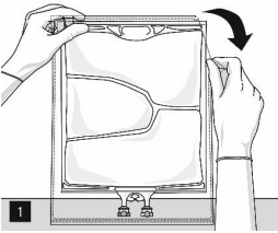 Åpning: Riv opp ytterposen ved å dra i rivekantene (figur 1). Ta posen ut av den beskyttende ytterposen. Kast ytterpose, oksygenindikator og oksygenabsorbent.