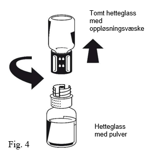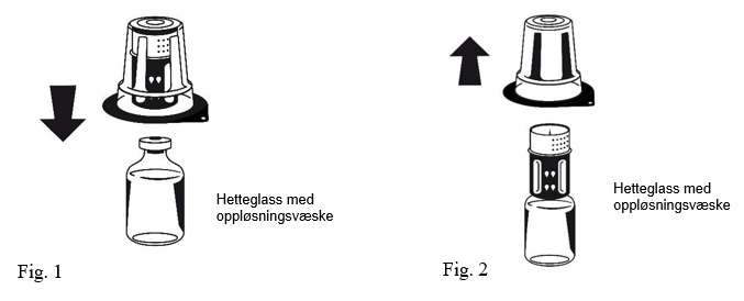 1. De uåpnede hetteglassene med henholdsvis pulver og oppløsningsvæske varmes opp til romtemperatur dersom dette er nødvendig. Denne temperaturen bør holdes under rekonstitueringen.