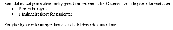 Mer informasjon om punktene over finner du i avsnittene “Graviditet”, “Amming” og “Fertilitet” og “Prevensjon for kvinner og menn”.