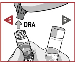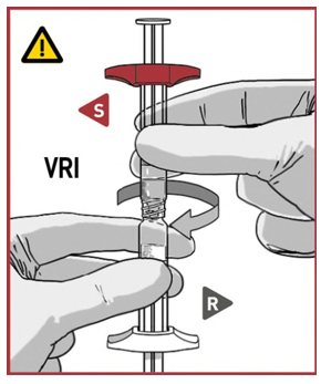 Velg sprøyten med oppløsningsvæske S med farget fingerstøtte og plasser den på TOPPEN av sprøyten med pulver R, eller tilt den forsiktig når du kobler den til.