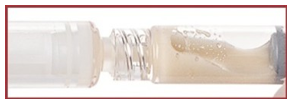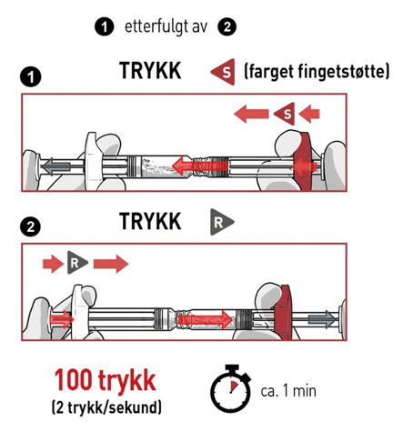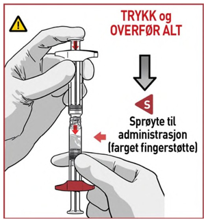 PÅSE at legemidlet flyter mellom begge sprøytene slik at det blir skikkelig blandet: legemidlet er viskøst og du må bruke makt når du trykker på stempelstengene.