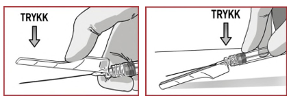 Dekk til kanyle ved å presse nålbeskyttelsen ned på kanyle med en finger eller ved å presse den mot et flatt underlag, og kast den umiddelbart i en beholder for skarpe gjenstander.
