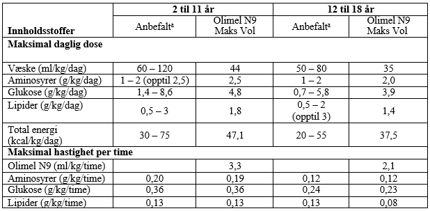 For Olimel N9 er de begrensende faktorene for de ovenfornevnte pediatriske aldersgrupper, aminosyre konsentrasjon for daglig dose. I aldergruppen 2 til 11 år er, de begrensende faktorene glukose konsentrasjon for hastighet per time. I aldergruppen 12 til 18 år er, de begrensende faktorene aminosyre konsentrasjonen både for hastighet per time. De resulterende inntakene vises nedenfor: