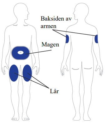 Helsepersonell kan hjelpe deg med å bestemme hvor på kroppen du skal injisere dosen. Du kan også lese avsnittet «Velg injeksjonssted» i denne bruksanvisningen for å hjelpe deg med å velge hvilket område som kan være best for deg.