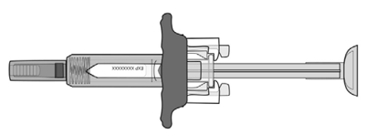 Hold den ferdigfylte sprøyten i sprøytekroppen med den tildekkede nålen pekende nedover som vist.