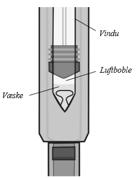 Kontroller væsken i den ferdigfylte sprøyten gjennom sprøytevinduet. Den skal være klar og fargeløs til svakt gul.