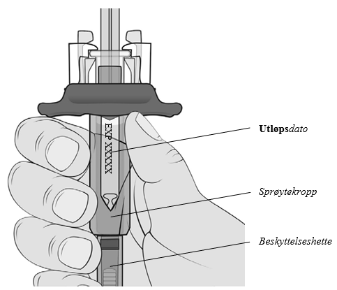 Fjern beskyttelseshetten ved å holde den ferdigfylte sprøyten i sprøytekroppen med én hånd og dra hetten rett av med den andre hånden.