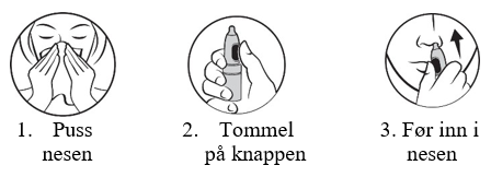 For å unngå at flasken drypper, stå oppreist og før den korte dysen inn i et nesebor.