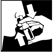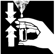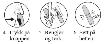 4. Før første gangs bruk, trykk 4 ganger for å klargjøre pumpen. Pumpen er deretter klar til bruk i behandlingsperioden. Hvis pumpen ikke avgir spray når du trykker på den, eller hvis den ikke har vært brukt i mer enn 7 dager, skal den igjen klargjøres med 4 trykk som beskrevet. Vær veldig forsiktig så du ikke får spray i øyne eller munn.
