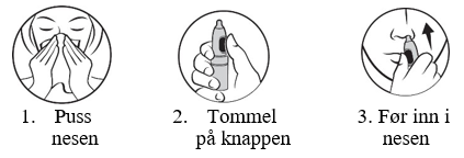 For å unngå at flasken drypper, stå oppreist og før den korte dysen inn i et nesebor.