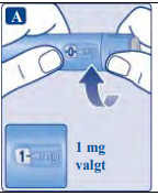 Det er kun dosetelleren og dosepekeren som viser at 1 mg har blitt valgt. Du kan kun velge 1 mg per dose. Når pennen inneholder mindre enn 1 mg, stopper dosetelleren før 1 mg vises. Dosevelgeren klikker forskjellig når den vris forover, bakover eller forbi 1 mg. Ikke tell penneklikkene. |
