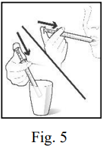 Ta legemidlet ved å plassere doseringspipetten i munnen og presse lett på stemplet. Press stemplet helt inn for å sikre at all oppløsning brukes. Dersom du ønsker kan du fortynne legemidlet i et glass vann eller alkoholfri drikke før du tar det. Drikk i så tilfelle hele glasset for å sikre at du får riktig dose av legemidlet (Fig. 5).
