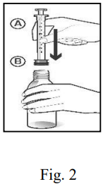 Sett flasken på en fast og jevn overflate. Åpne plastposen med doseringspipette/adapter i den perforerte enden og ta ut doseringspipetten (A) med påsatt adapter (B). Sett adapter med doseringspipetten godt fast i flaskehalsen (Fig. 2).