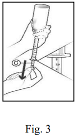 Snu flasken opp ned for å fylle doseringspipetten. Mens du holder doseringspipetten på plass, trekker du forsiktig stemplet (C) ned til streken som tilsvarer dosen legen har forskrevet (se avsnittet "Hvordan du bruker Palexia”). Ta ikke ut doseringspipetten på dette tidspunktet! (Fig. 3).