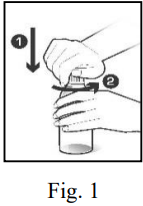Flasken har barnesikret skrukork. For å ta av korken, press den ned og skru den mot klokken (Fig. 1). Ta av korken og riv av forseglingen på toppen av flasken. Hvis forseglingen er skadet skal du ikke bruke legemidlet, men snakke med apotek.
