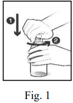 Flasken har barnesikret skrukork. For å ta av korken, press den ned og skru den mot klokken (Fig. 1). Ta av korken og riv av forseglingen på toppen av flasken. Hvis forseglingen er skadet skal du ikke bruke legemidlet, men snakke med apotek.
