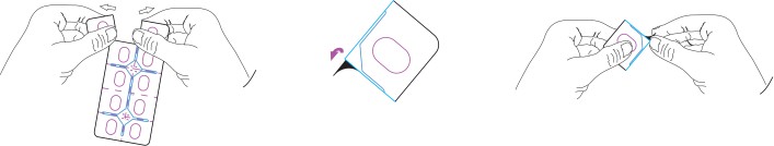 Ta ut en dose ved å rive langs den perforerte linjen på blisterarket og dra av folien på blisteren for å få ut tabletten.