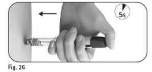 5.3 Hold doseinnstillingsknappen inne i minst 5 sekunder før du trekker kanylen ut av huden (figur 26).