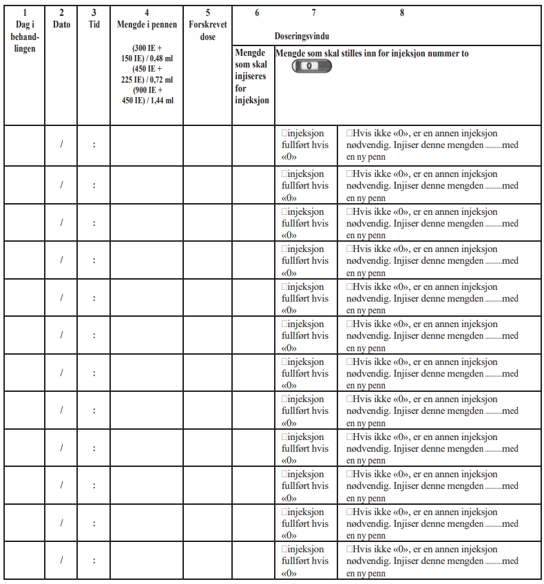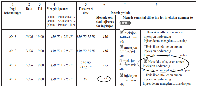 Et eksempel på en behandlingsdagbok som bruker en penn med (450 IE + 225 IE) / 0,72 ml: