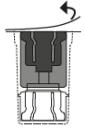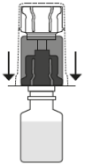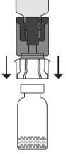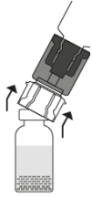 Plasser hetteglasset med Prolastina pulver i stående posisjon på underlaget. Snu enheten med hetteglasset med oppløsningsvæsken og adapteren opp-ned 180º. Press den gjennomsiktige/hvite delen av adapteren rett ned - uten å vri - inntil nålen perforerer proppen og overføringssettet klikker på plass.
