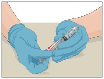 1. Sett infusjonsnålen på en sprøyte som inneholder Prothromplex-oppløsningen. Et infusjonssett med vinger (butterfly) anbefales. Rett nålen oppover, og fjern eventuelle luftbobler ved å banke lett på sprøyten med fingeren og skyve luften langsomt og forsiktig ut av sprøyten og nålen.