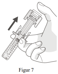 Fjern tommelen sakte fra stempelhodet, slik at den tomme sprøyten beveger seg oppover og hele kanylen blir dekket av kanylebeskyttelsen som vist i figur 7.