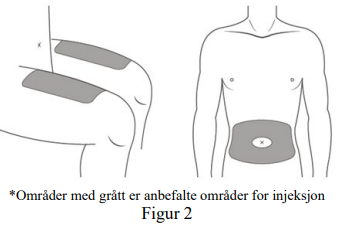Gode steder for injeksjon er øvre lår og rundt mage (abdomen) minst 5 cm fra navlen.