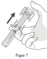 Fjern tommelen sakte fra stempelhodet, slik at den tomme sprøyten beveger seg oppover og hele kanylen blir dekket av kanylebeskyttelsen som vist i figur 7.