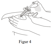 I én rask bevegelse stikk kanylen inn gjennom huden så langt det lar seg gjøre (se figur 4).
