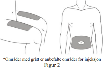 Gode steder for injeksjon er øvre lår og rundt mage (abdomen) minst 5 cm fra navlen.