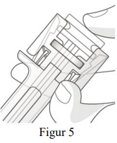 Injiser hele mengden legemiddel ved å trykke ned stempelet helt til stempelet er fullstendig nede mellom kanylebeskyttelsevingene (se figur 5).