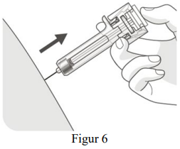 Når stempelet er så langt ned som det kan gå, fortsett å trykke på stempelhodet mens du drar ut kanylen og slipper huden (se figur 6).