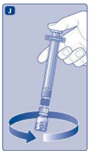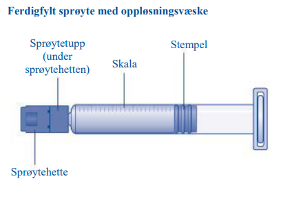 Advarsel: Den ferdigfylte sprøyten er laget av glass og er utformet til å passe sammen med standard koblinger med luer-lås. Noen nålefrie koblinger som har en innvendig spiss passer ikke sammen med den ferdigfylte sprøyten. Denne uforlikeligheten kan hindre administrering av legemidlet og/eller føre til at den nålefrie koblingen skades.
