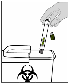 a. Legg den brukte pennen i en godkjent avfallsbeholder for skarpe gjenstander umiddelbart etter bruk.
